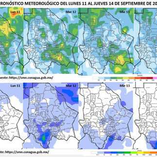 Para hoy lunes 11 el monzón mexicano sobre el noroeste de México en interacción con inestabilidad en niveles altos de la atmósfera, circulación anticiclónica en niveles medios de la atmósfera, un canal de baja y la aproximación de un nuevo frente frio a la frontera norte favorecerá ambiente de templado a cálido por la mañana, de caluroso a muy caluroso por la tarde, temperaturas frescas en la zona serrana, cielo de despejado a parcialmente nublado.