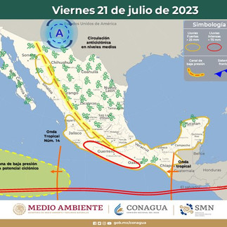 Para hoy viernes 21 de julio el monzón mexicano sobre el noroeste de México en interacción con divergencia en altura, circulación anticiclónica en niveles medios de la atmósfera, un canal de baja presión y la entrada de humedad procedente de ambos litorales favorecerá ambiente de templado a cálido por la mañana, de muy caluroso a extremadamente caluroso por la tarde, temperaturas frescas en la zona serrana, cielo de despejado a mayormente nublado.